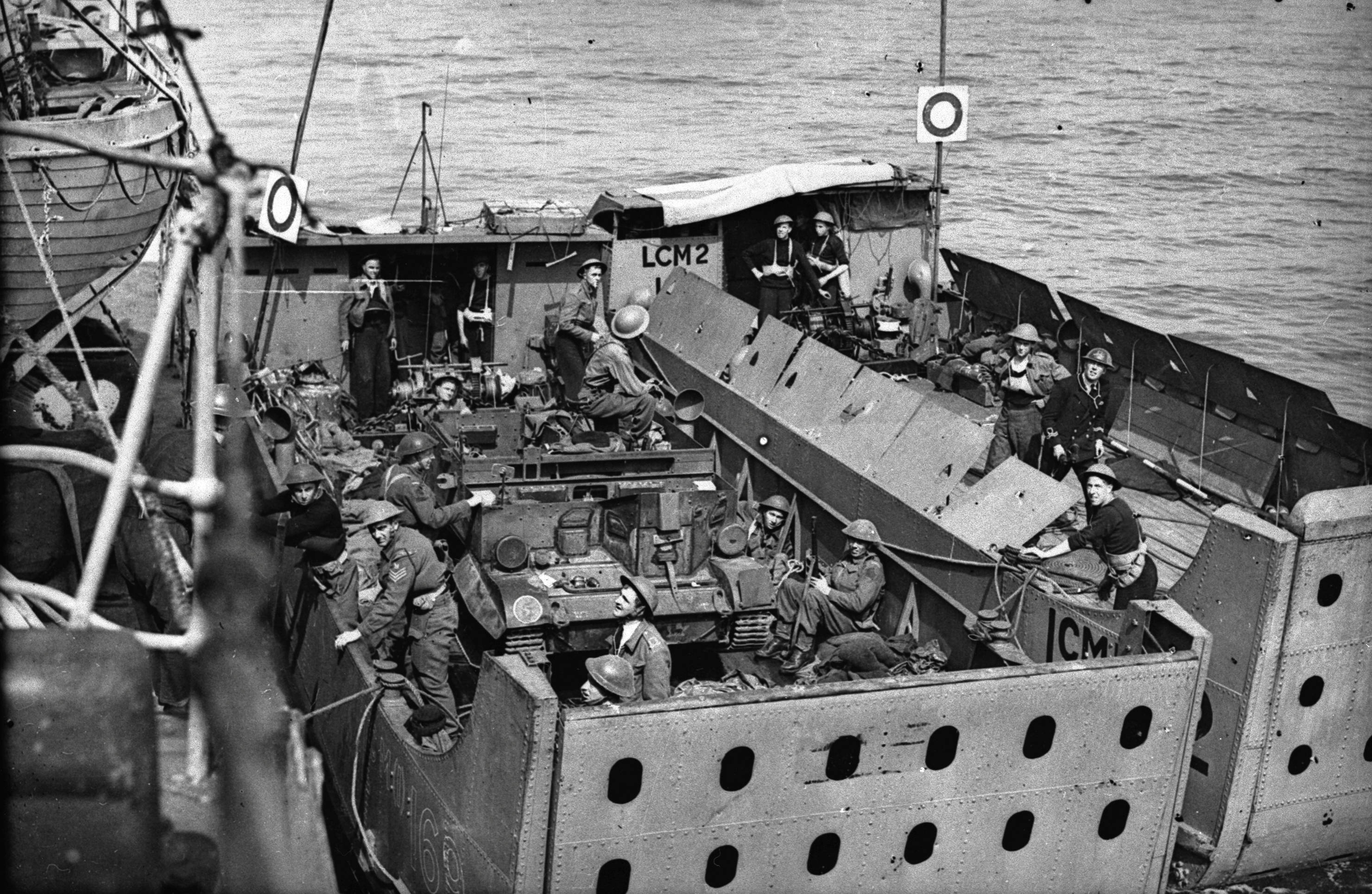 Landing Craft carrying Canadian troops and a Universal Carrier alongside a destroyer, off the coast of Dieppe, France, during Operation JUBILEE, 19 Aug 1942.