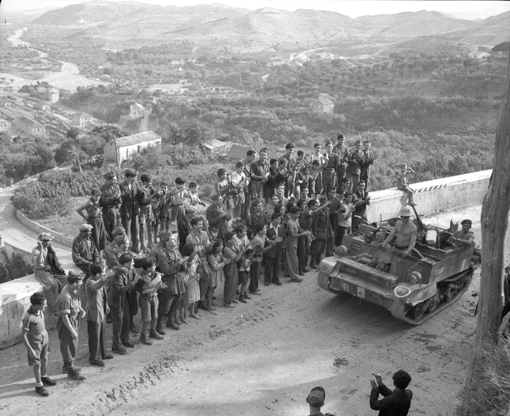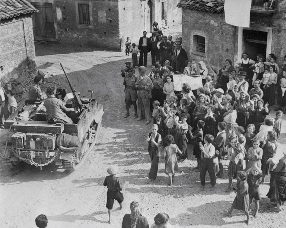 Italians welcome Canadian troops (Princess Louise Dragoon Guards) at the entrance of Catanzaro.