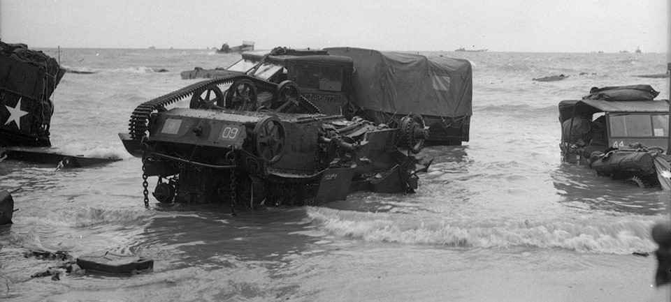 Universal Carrier, Queen’s Own Rifles mortar carrier and crew, (driver survived) from Serial 1525, LCT IV 885. The 1/4-ton jeep belonged to 14th Field Regiment, RCA. It was only swamped and was recovered. The truck appears to be a CMP, all on Juno beach on the D-Day landings, 6 June 1944. (Mark Twostar)