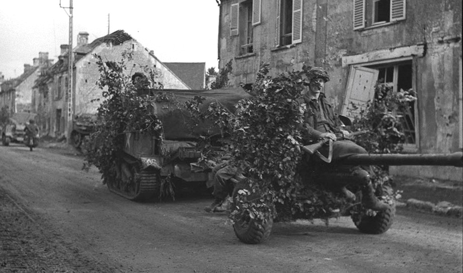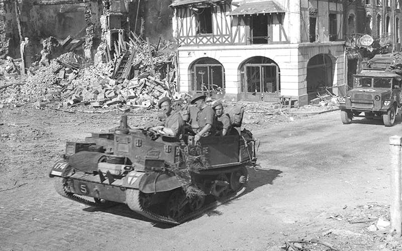 Bren Carriers with 6-pound A/T guns speeding through wrecked town in Normandy, as they move forward, 4 July 1944.