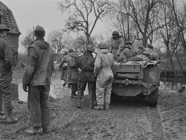 Canadian and German soldiers unload wounded soldiers from a Universal Carrier at the Regimental Aid Post near Udem, Germany, 27 February 1945.