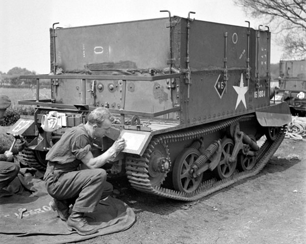 Private J.D. Hamilton stencilling a maple leaf on a Universal Carrier of The Highland Light Infantry of Canada, England, 19 May 1944.