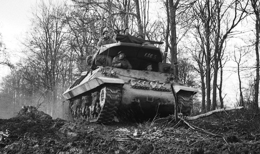 17-pounder Achilles self-propelled gunsr moving up through the forest to protect the advance of the 2 Canadian Infantry Division in the vicinity of Xanten, Germany, 9 March 1945.
