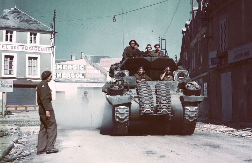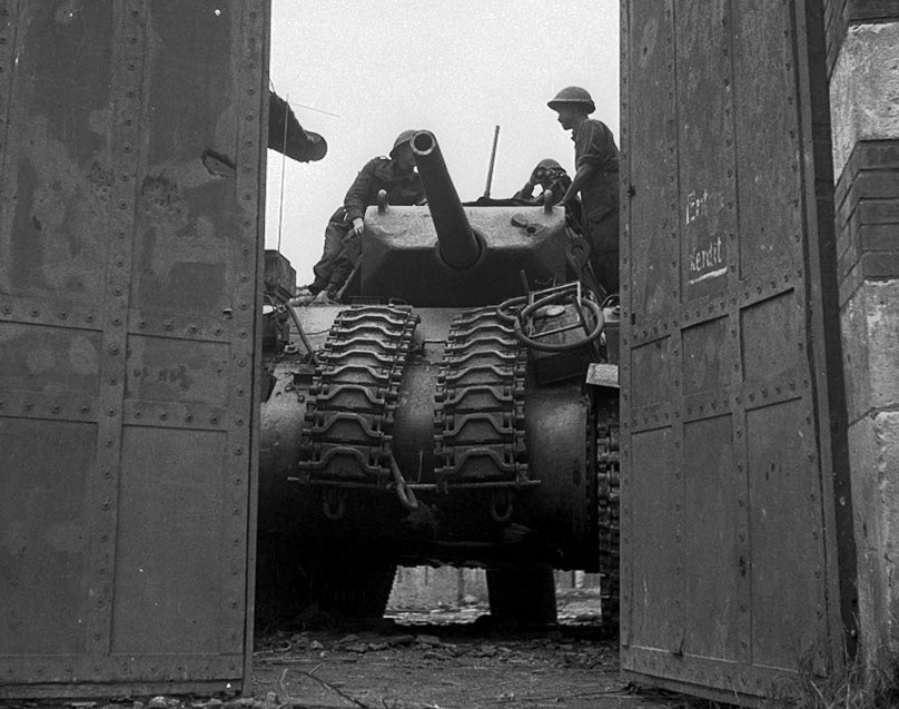 Sargeant G.S. Aikinson and crew on top of an American Gun Motor Carriage M10 (3-inch Gun) self-propelledTanti-tank gun, which has taken cover between the iron gates of a French Barracks in Normandy, 23 July 1944.