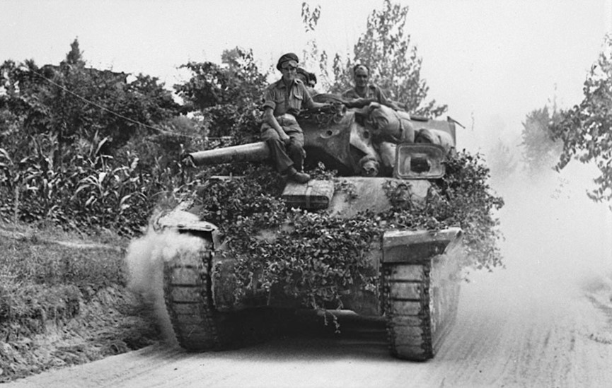17-pounder Achilles self-propelled gun, (M10C Tank Destroyer) and the American Gun Motor Carriage M10 (3-inch Gun), were used by the British, Canadian and Polish armies in Italy and northwest Europe. During operation Totalize, the Canadian 6th Anti-Tank regiment were ordered to add armoured roofs to their 3-inch M10s. 2 Canadian Corps included the 6th Canadian Anti-Tank Regiment, Royal Canadian Artillery (It was not equipped with 17-pdr M10s until September 1944, but had two batteries of 3-inch M10’s and two batteries of towed 17-pounder anti-tank guns prior to this).