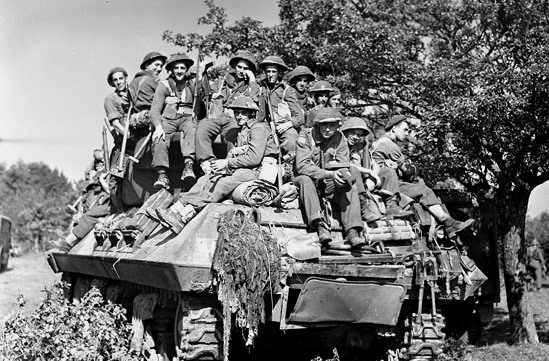 Infantrymen of Le Régiment de la Chaudière riding on a 17-pounder Achilles self-propelled gun of the 3rd Anti-Tank Regiment, Royal Canadian Artillery (RCA) during the attack on Elbeuf, France, 26 August 1944.