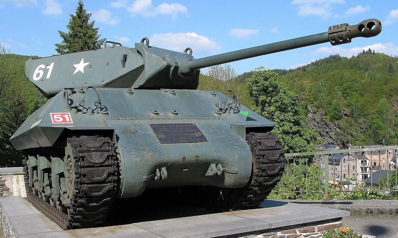 17-pounder Achilles self-propelled anti-tank gun preserved as a Battle of the Bulge memorial in La Roche-en-Ardenne, France.