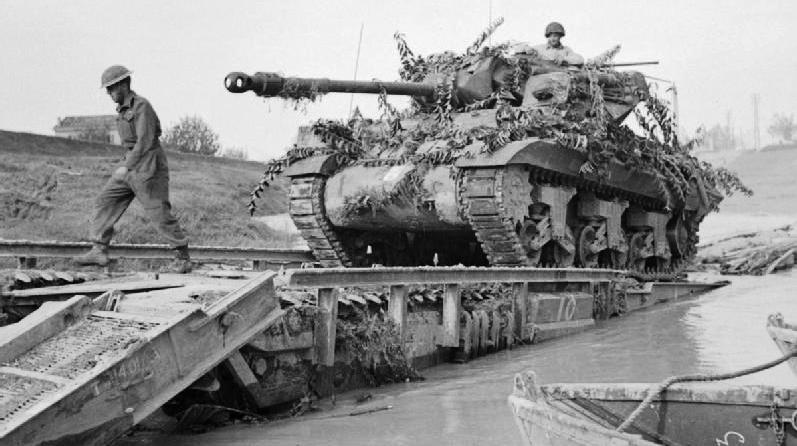 17-pounder Achilles self-propelled gun crossing the River Savio on a Churchill ARK which was driven into the river, Italy, 24 Oct 1944.