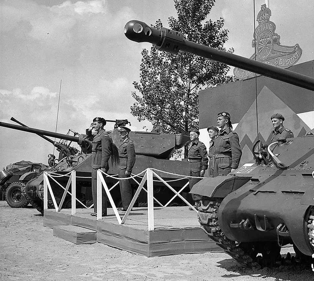 General Guy Simonds taking the salute of the 2nd Canadian Corps, flanked by a a pair of 17-pounder Achilles self-propelled guns, 31 May 1945.