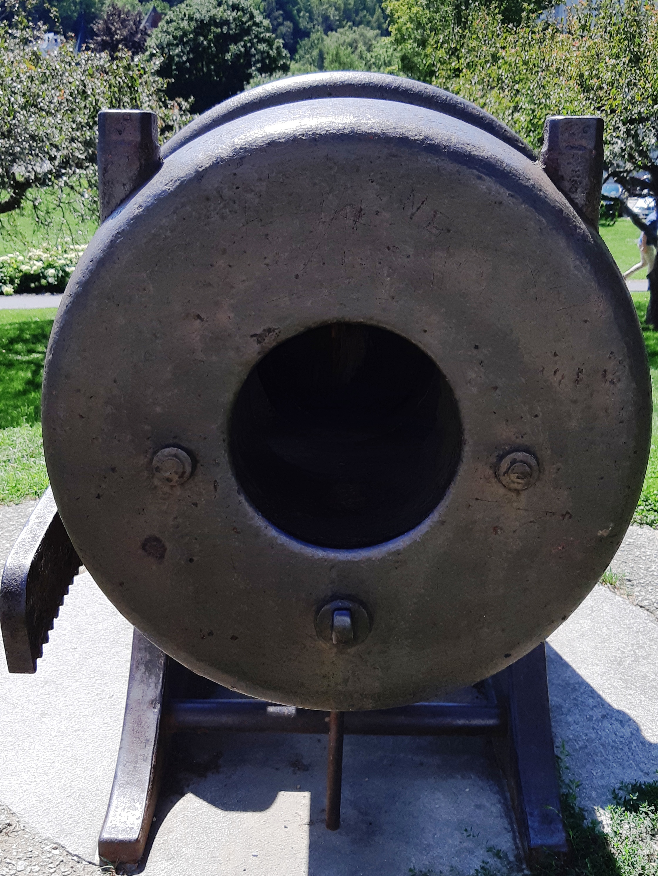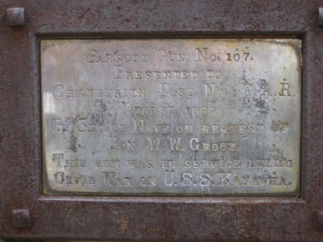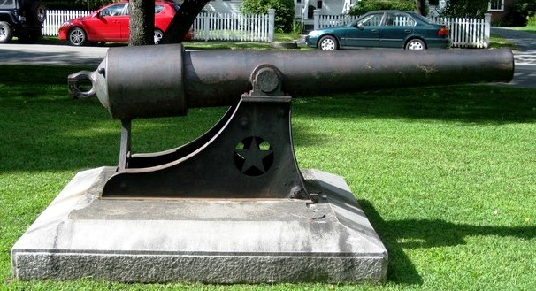 A10-Inch Rodman, Pattern 1861, Reg. No. 128, weight 15,140 lbs, mounted on a large stone pedestal in Middlebury, Vermont. It was manufactured for the US Army by Cyrus Alger and Company in 1866. The pedestal notes that the display was dedicated in 1910 by the Grand Army of the Republic.