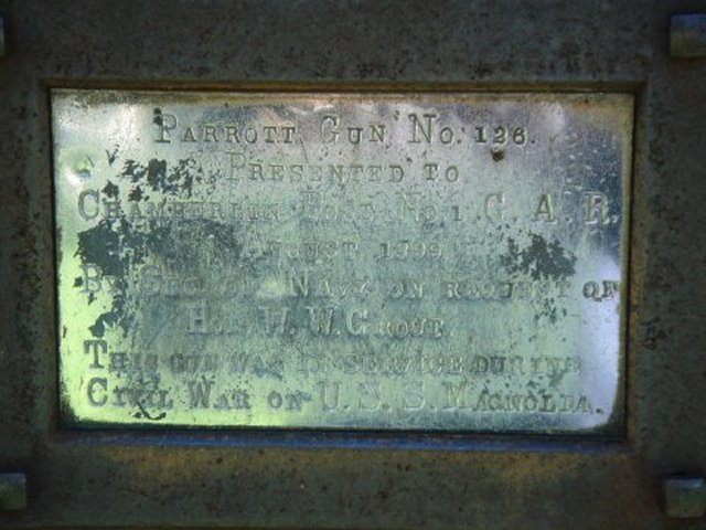 4.2-inch (30-pounder) Parrott Rifle, Naval Model, 3,470 lbs, Serial No. RPP No. 278 on the breeching ring and front site mount, P, RHH on the left trunnion. 1864, 30-POUNDER on the right trunnion. GAR Memorial Square.