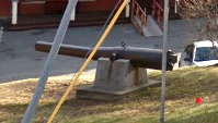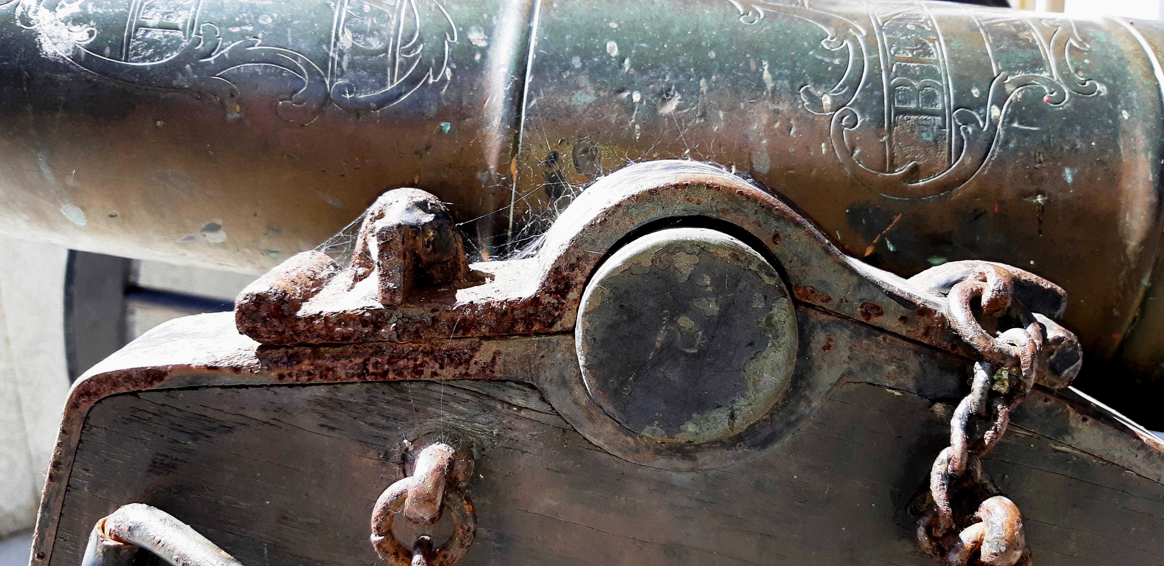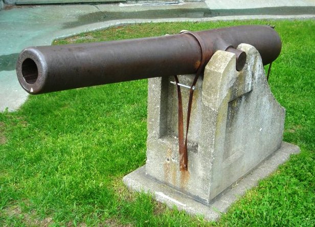 In service, this type of cannon would have been mounted on a wrought iron carriage. The oval-shaped sockets in the rear of the cannon were to allow levers to change the elevation of the gun. This cannon is a smoothbore designed to fire projectiles which were 10-inches in diameter. In service, this cannon could fire either an approximately 125-pound round short or an approximately 100-pound explosive shell.