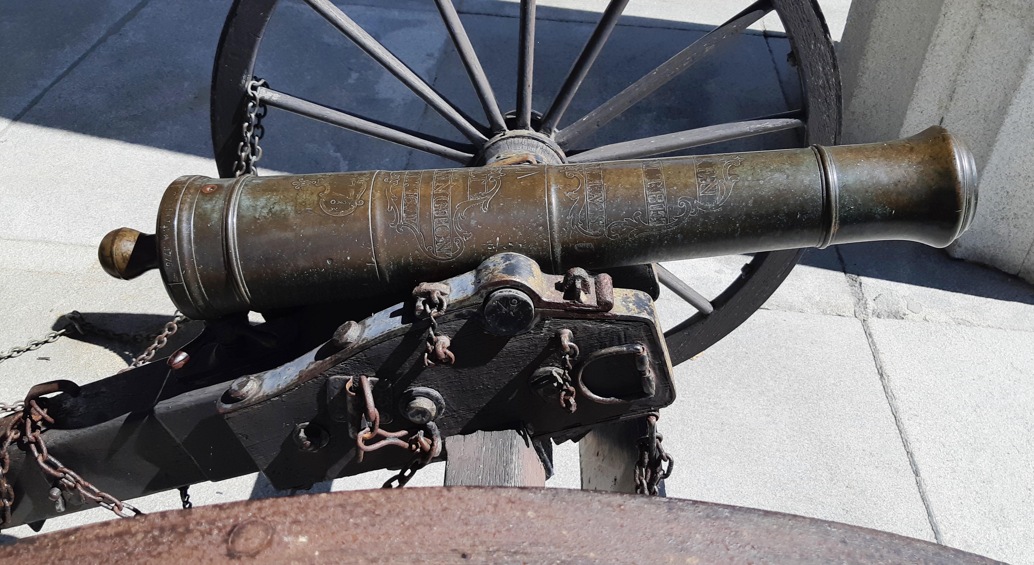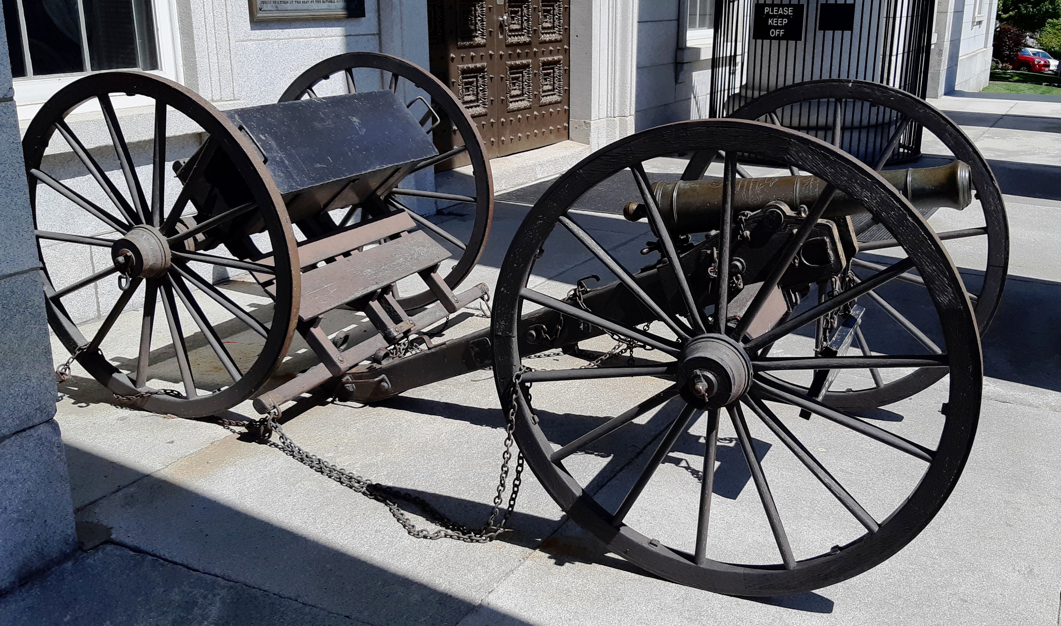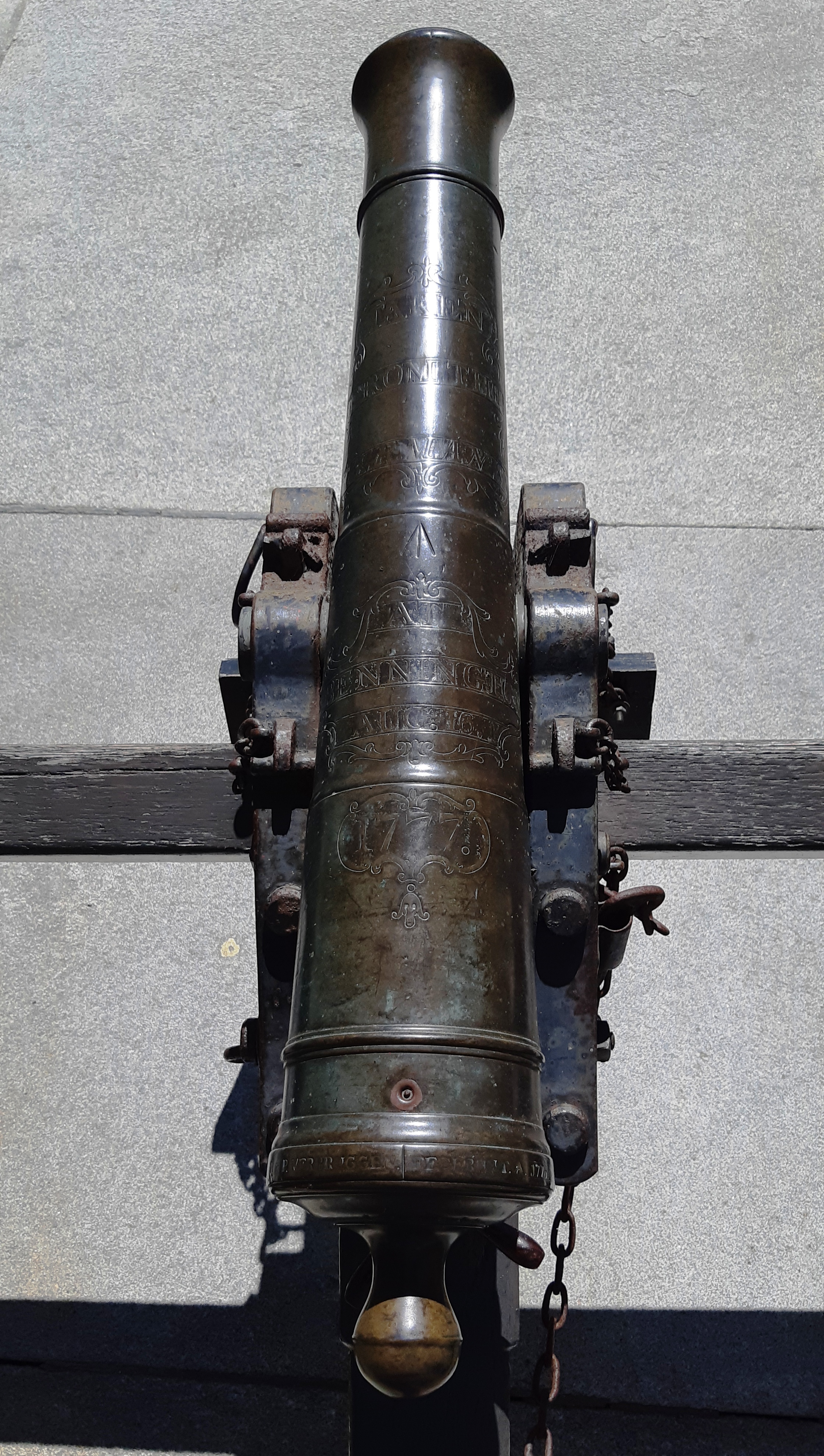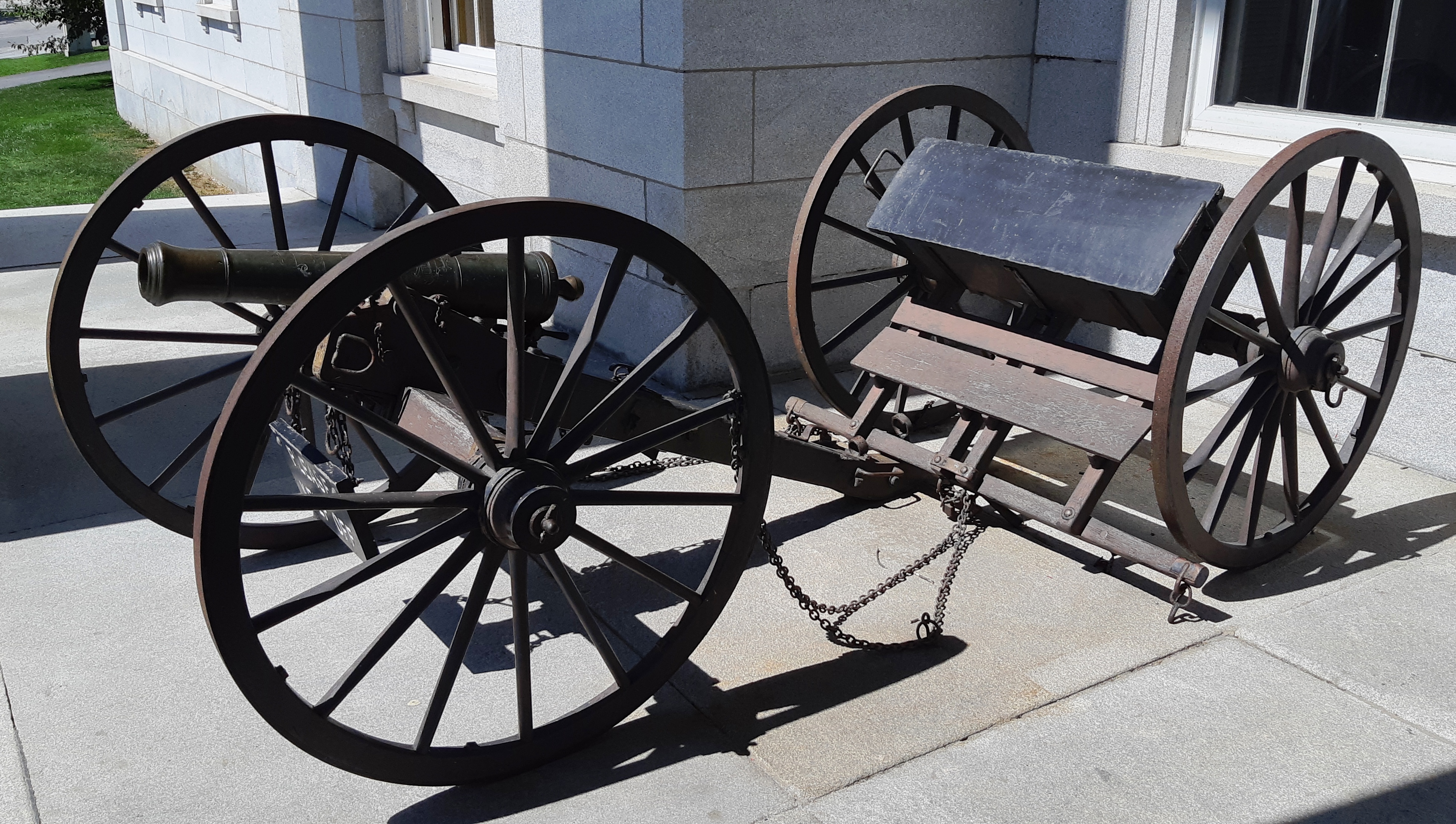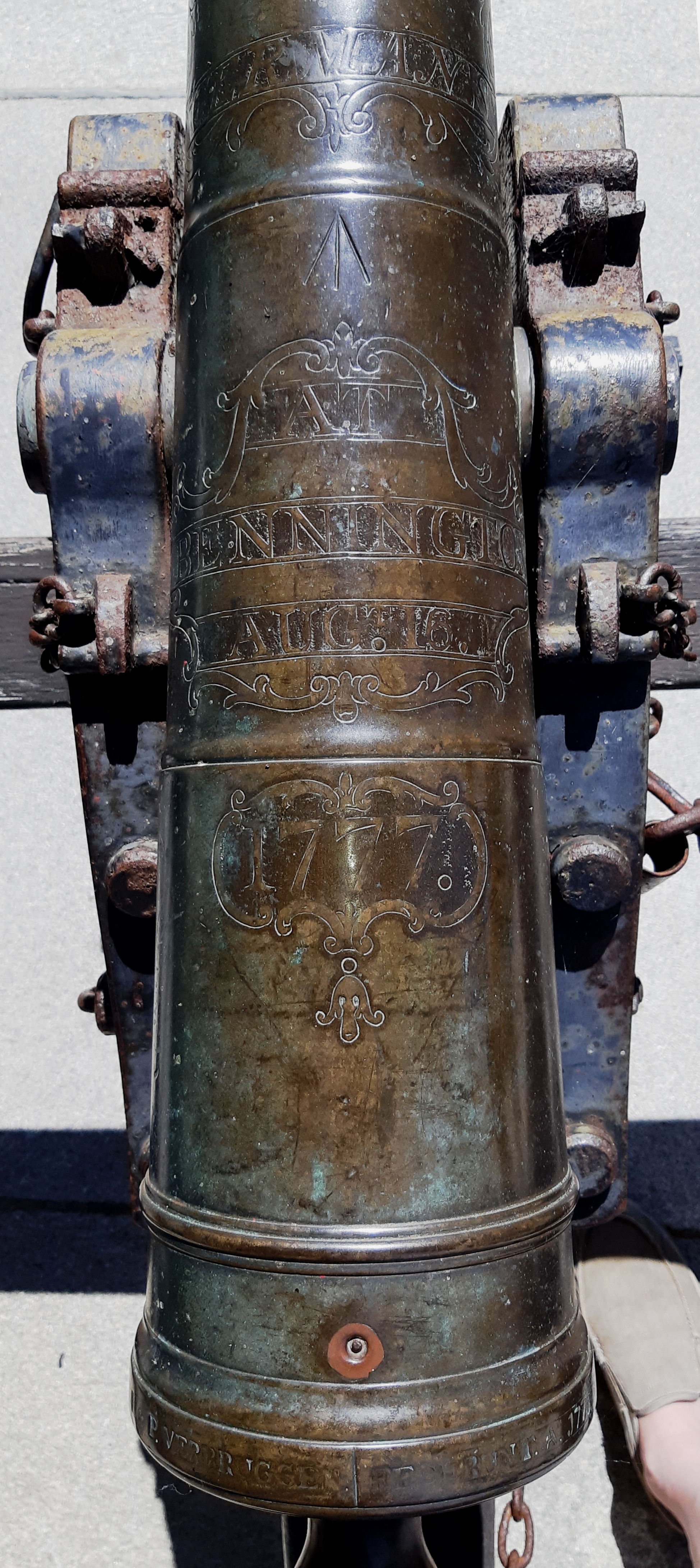 Bronze smoothbore muzzle-loading Light Gun, mounted on a wheeled carriage with limber. This is a Hessian field piece, captured from Lieutenant Colonel Friedrich Baum’s Hessian mercenaries at the Battle of Bennington. An inscription on top of the barrel reads: “Taken from the Germans at Bennington 16 Aug 1777”. This gun stands in front of the State House portico.