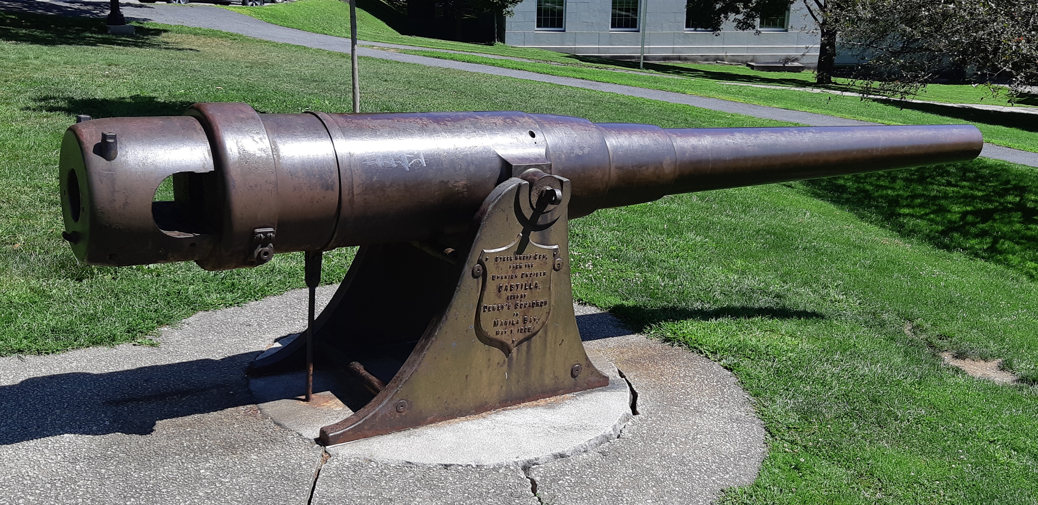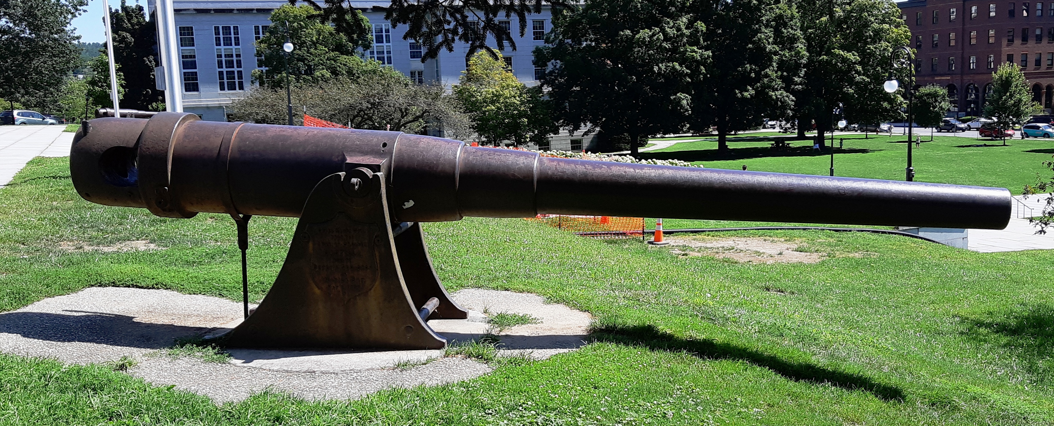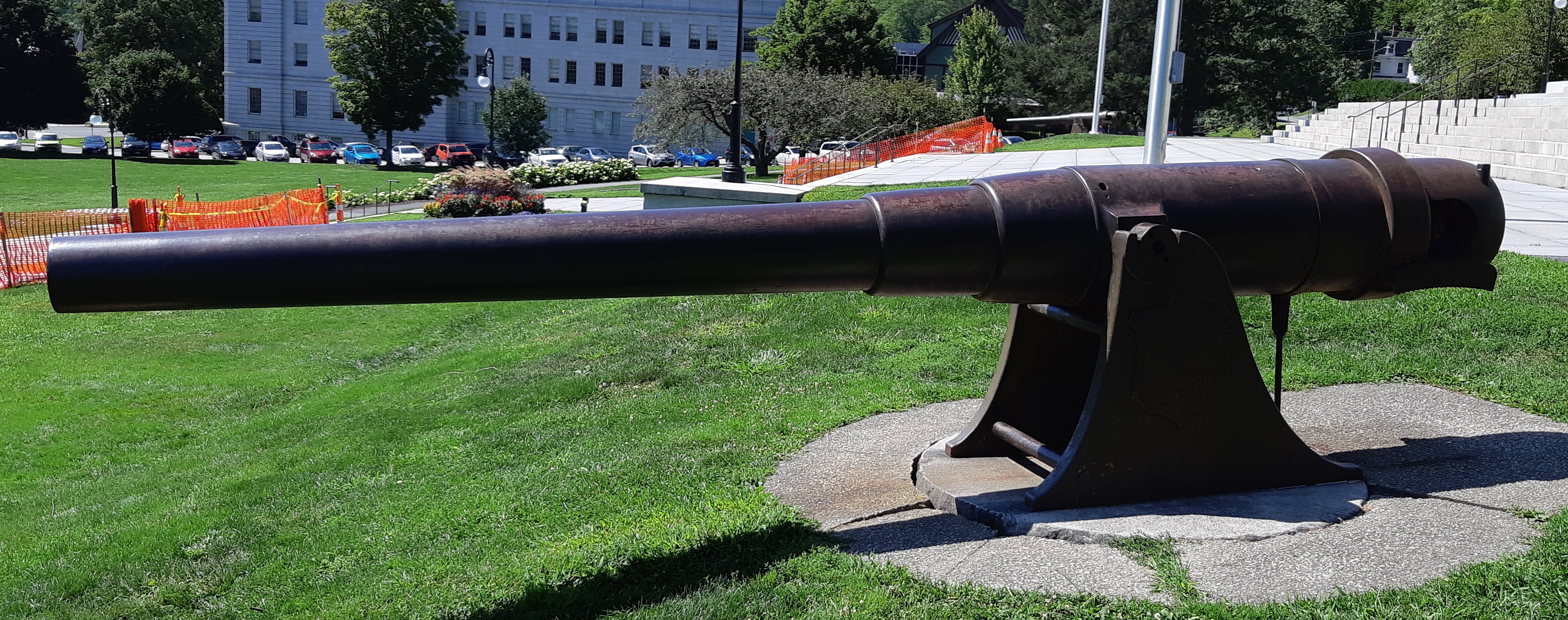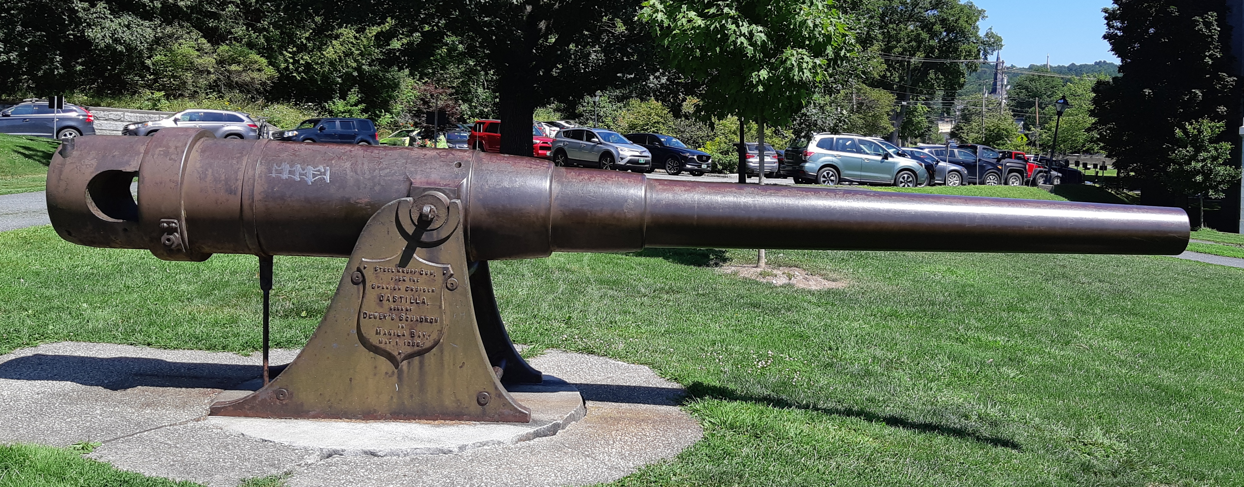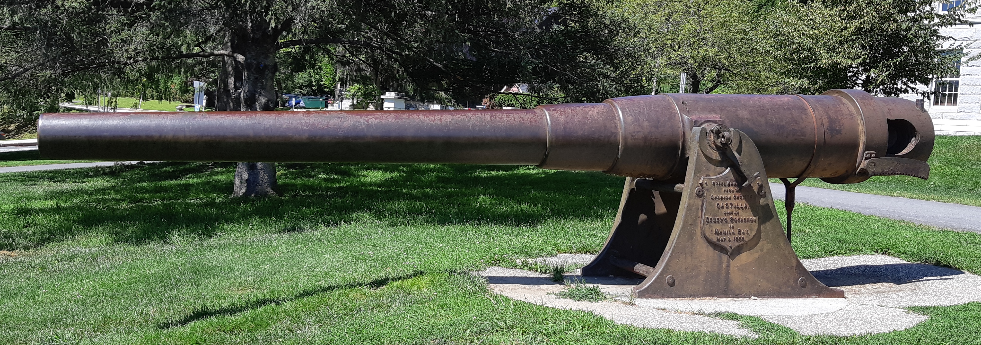 Krupp 15-cm SK (schiffkanone) L/35 naval rifle of 1890 vintage, Krupp Steel, taken from the Spanish cruiser Castilla, sunk by Admiral Dewey’s squadron in Manilla Bay, 1 May 1898. Mounted on an iron stand in front of the State House, No. 1 of 2. Admiral George Dewey was a native of Montpelier.