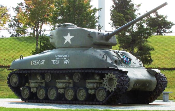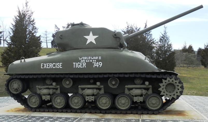 M4A1(76) HVSS Sherman Tank, Exercise Tiger Memorial, VFW Post 1531, 477 Park St.  This Sherman Tank stands near the Fort Taber Military Museum at the southern tip of eastern New Bedford.  It is the centerpiece of a monument dedicated to those who lost their lives in Exercise Tiger, in preparation for the D-Day landings at Normandy.  During this exercise on 28 April 1944, German E-boats sank two tank landing ships and crippled a third, killing 749 US servicemen (551 Army and 198 Navy).  These were the heaviest American losses for a battle up to that point in the war after Pearl Harbor.  The exercise and D-Day went on as planned.