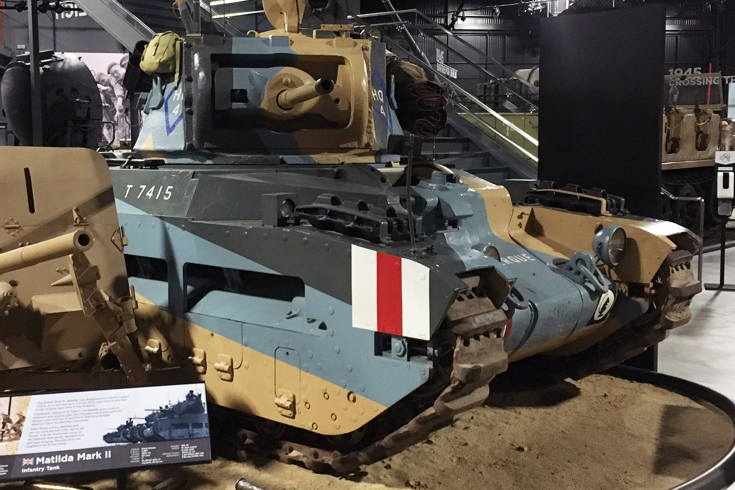 British Churchill Mk. VII Crocodile flamethrowing tank, indoors. Similar to this one at the U.S. Army Armor & Cavalry Collection at Fort Benning, Georgia.