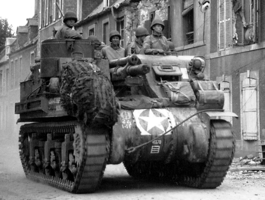 M7B1 105-mm Priest SP Gun of the 14th Armored Field Artillery Battalion of the 2nd Armored Division at the intersection of Holgate Street and the railway line Paris-Cherbourg, Carentan, France, 18 June 1944.
