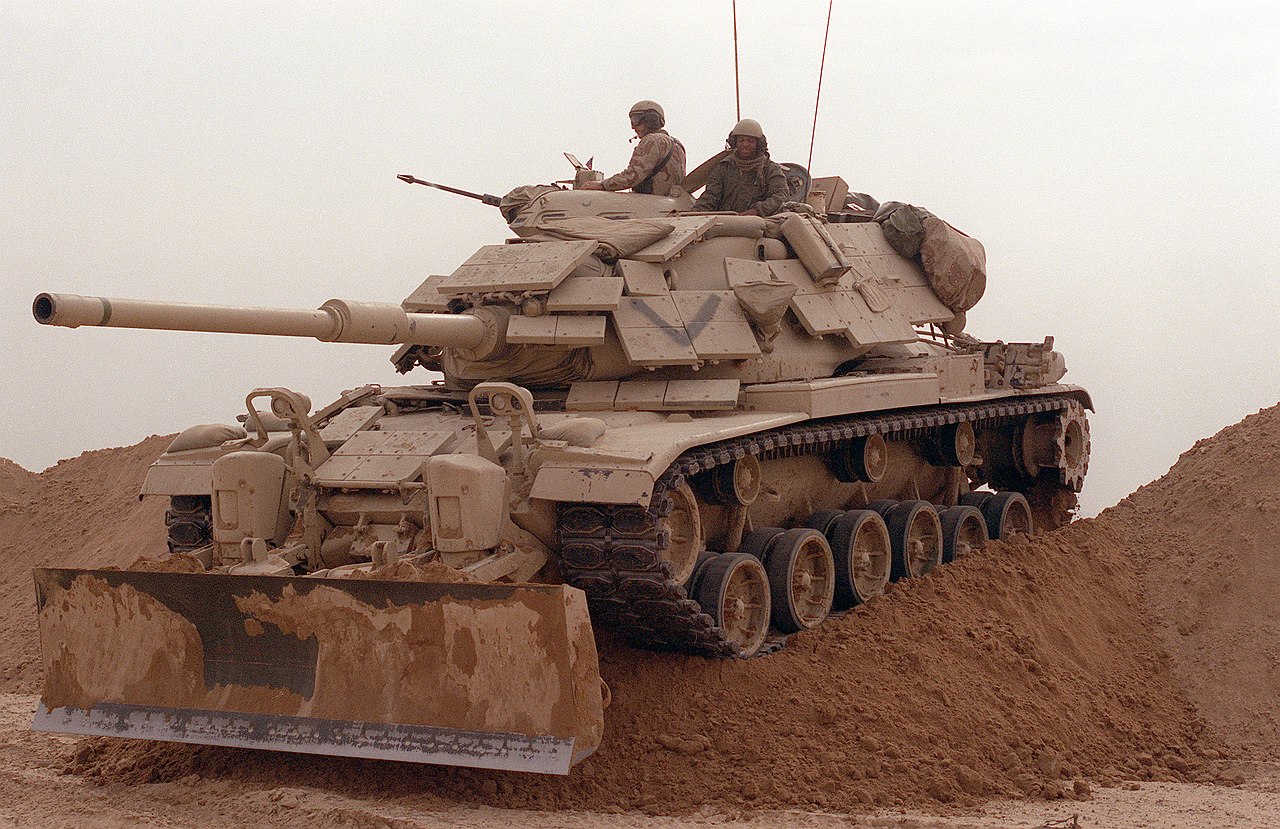 Marines from Company D, 2nd Tank Battalion, drive their M-60A1 main battle tank over a sand berm on Hill 231 while rehearsing their role as part of Task Force Breach Alpha during Operation Desert Storm. The tank is fitted with reactive armor and an M-9 bulldozer kit, 25 Jan 1991.