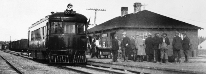 Electric coach at Kirkland Lake Station, this car ran between Swastika and Cheminis, Ontario, c. 1927.
