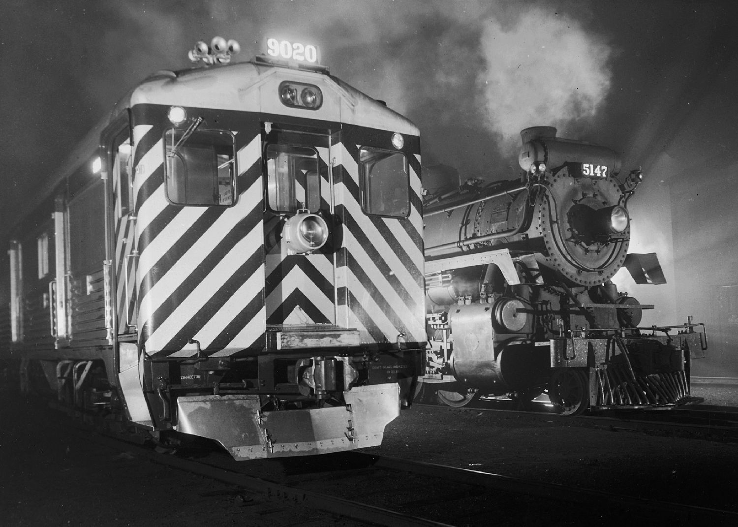 Canadian Pacific Railway car No. 9020, No. 5147 – M 6044 R.D.C. – Dayliner beside Mikado steam locomotive, North Bay, Ontario.