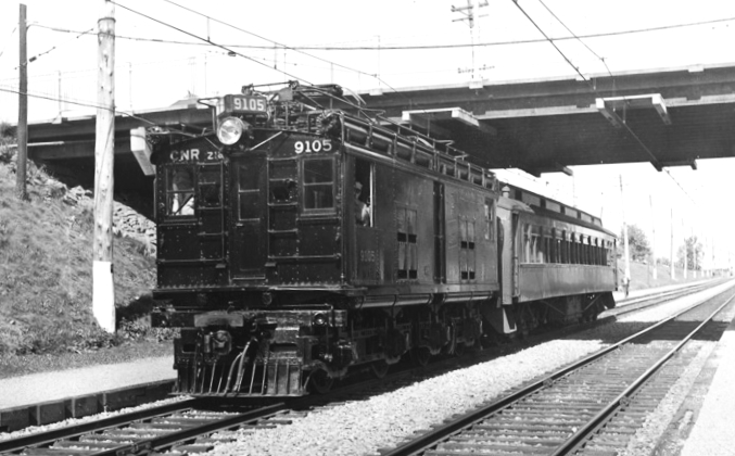 Canadian National Mount Royal Tunnel electric locomotive 9105 with train from Cartierville at Park Avenue, Montreal.