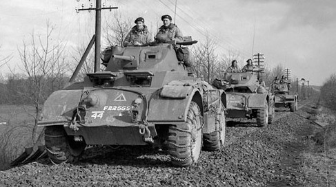 General Motors T17E1 Staghound armoured cars of “A” Squadron, 12th Manitoba Dragoons, in the Hochwald, Germany, 2 March 1945.
