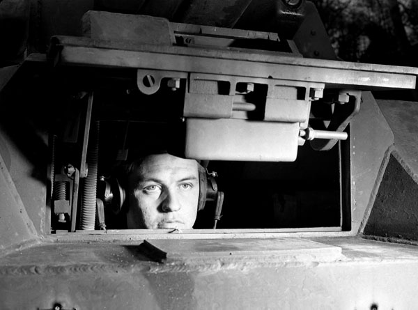 Armoured car operator of the 12th Manitoba Dragoons seen through vehicle window, 12th Manitoba Dragoons, 24 March 1943.