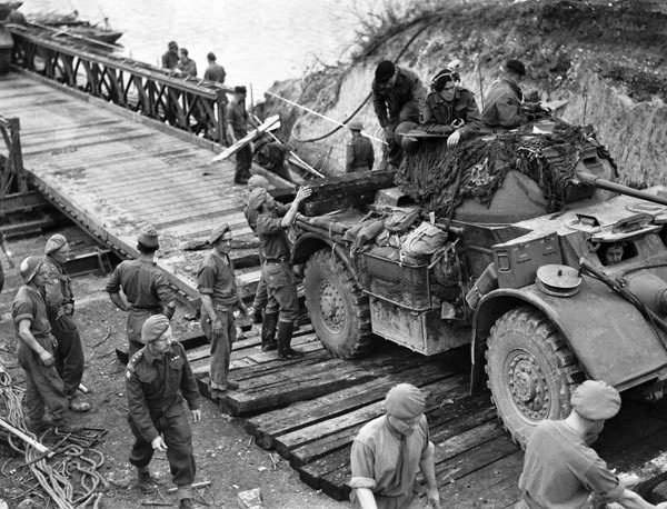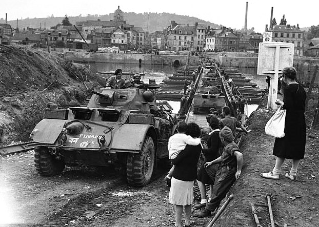 A General Motors Staghound T-17E1 armoured car of the 12th Manitoba Dragoons crossing a Bailey bridge, Elbeuf, France, 28 August 1944.