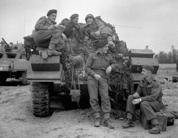 Troopers of the 18th Armoured Car Regiment (12th Manitoba Dragoons) with a T-17E1 Staghound 4X4 near Caen, France, 19 July 1944.