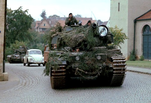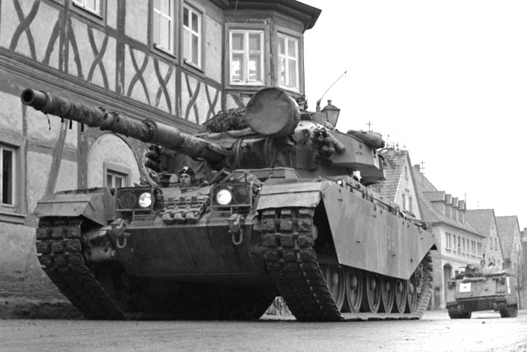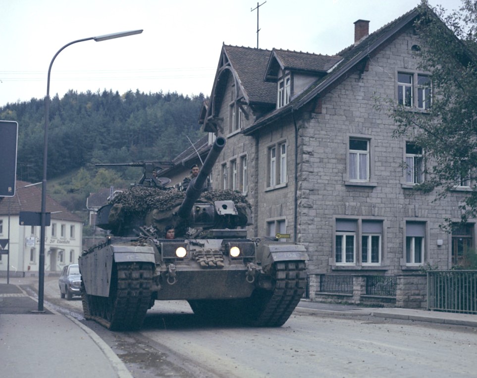 Ex Reforger 74, A Centurion tank passing through an old town in Bavaria, Germany, Oct 1974.