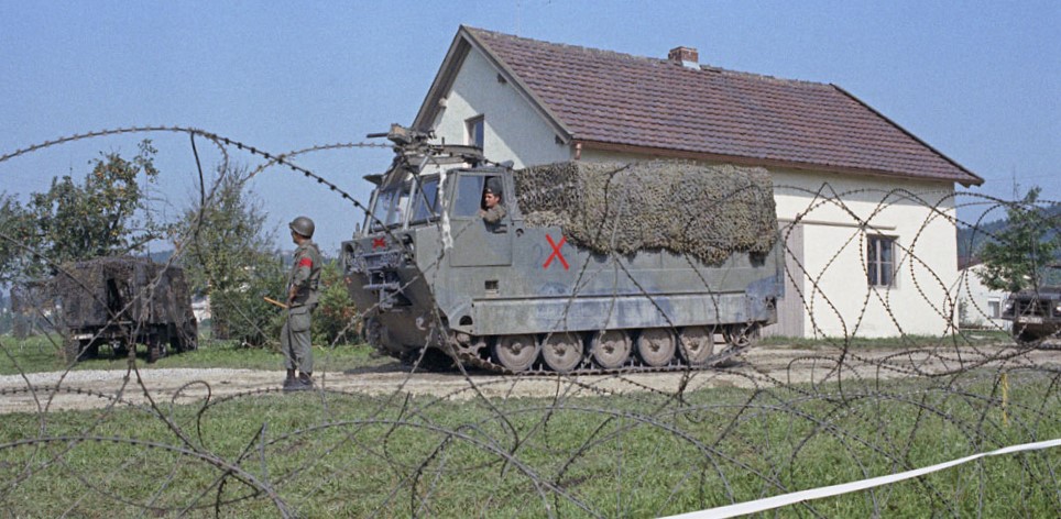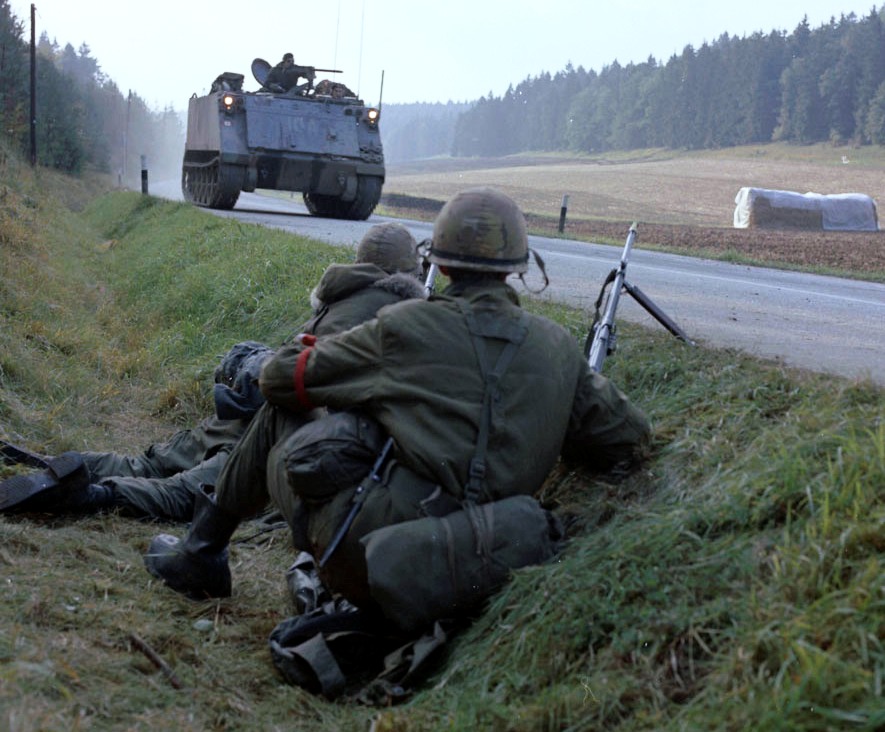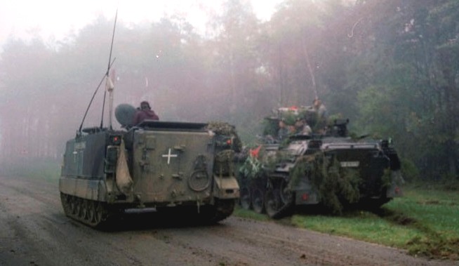 Fallex 76, M113 and German Marder passing in fog, Germany, 1976.