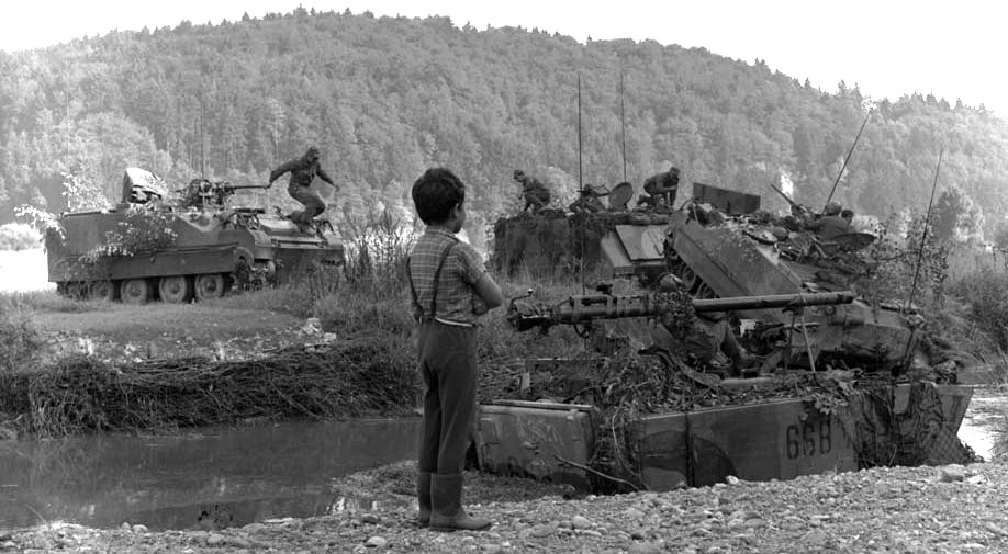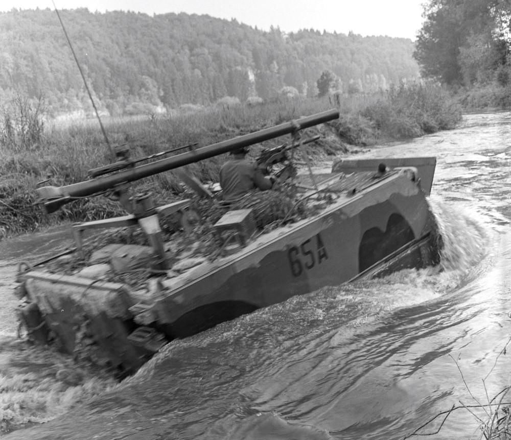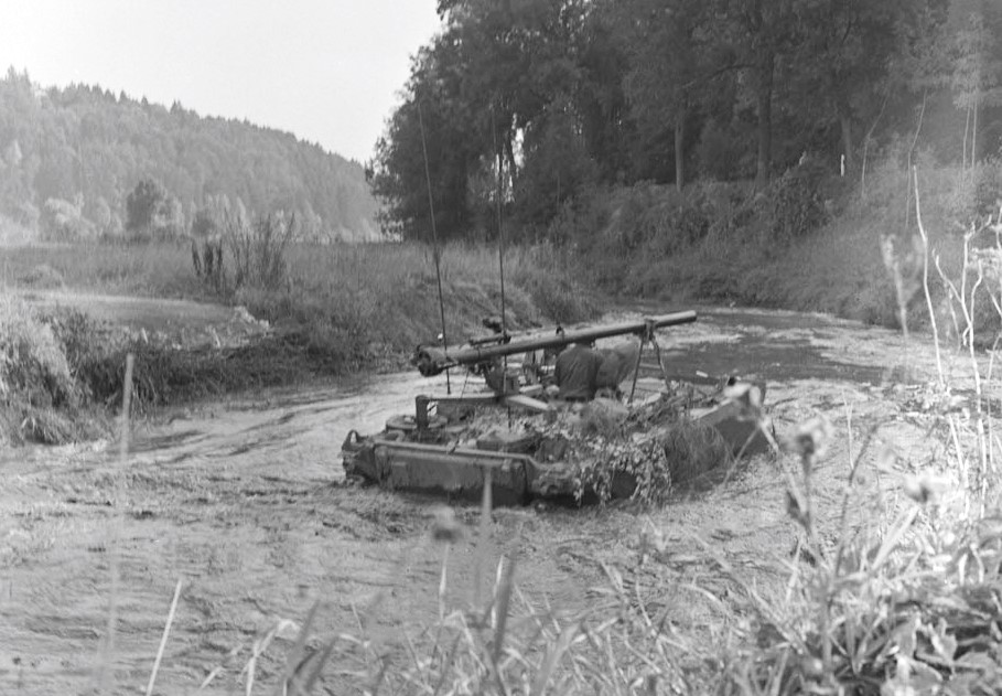 Ex Gutes Omen, southern Germany, M113 APC armed with a 106-mm recoilless rifle, climbing a bank of the Danube river, 25 September 1971.