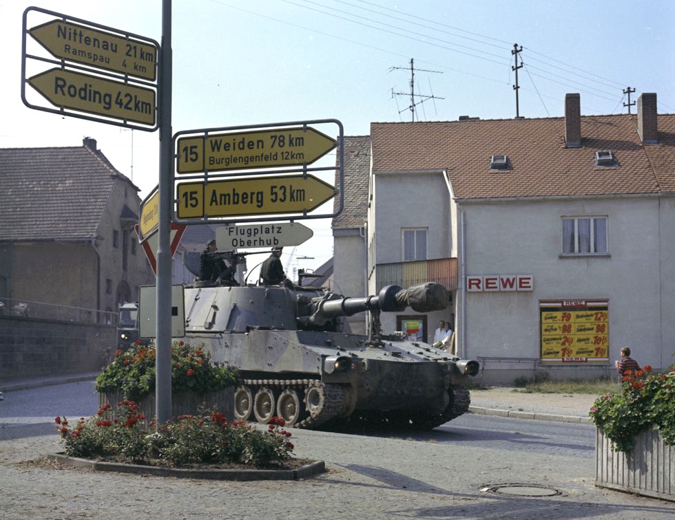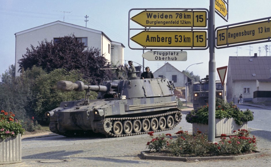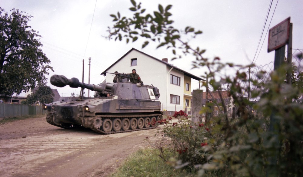 Ex Reforger 1974, 155-mm M-109 self-propelled howitzer of 1 RCHA moving past a German house in Bavaria.