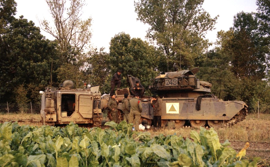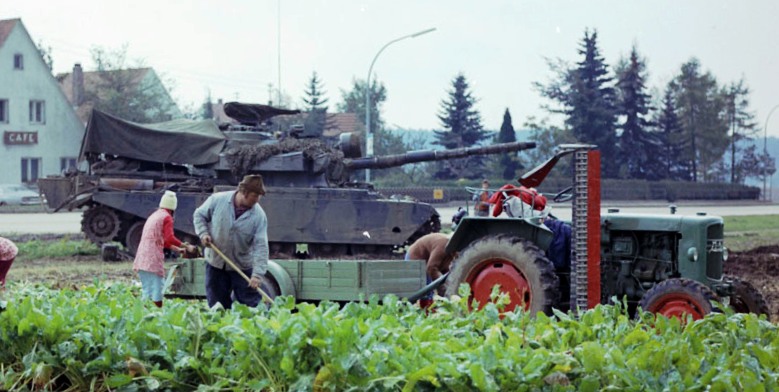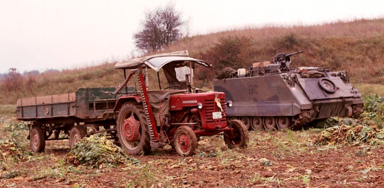 Ex Reforger 74, M113 APC with a Centurion tank broken down in a German sugar beet field in Bavaria, October 1974.