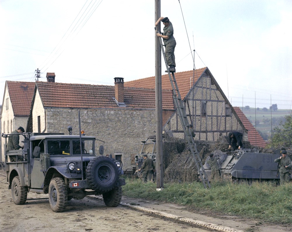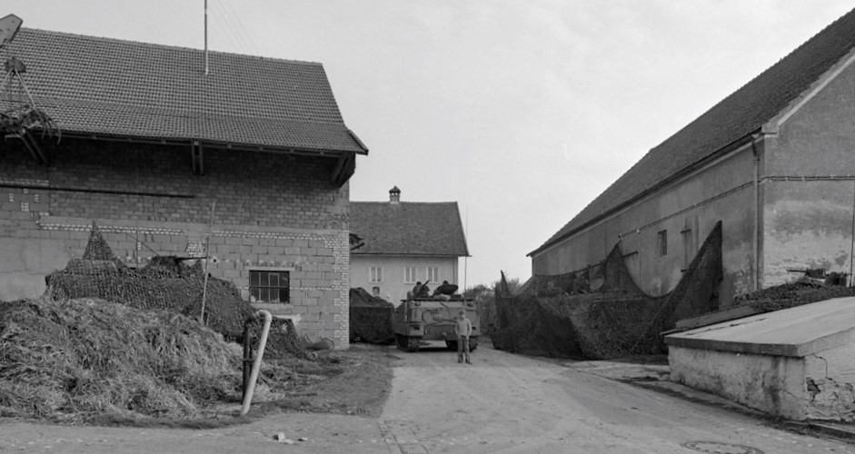 Ex Reforger 74. A Lynx of 3 Mechanized Commando pauses in a small-town German street during Ex Reforger 74. Driver is Cpl Lorne Brown with 3 Mech Cdo and crew commander is MWO Michael Bond, October 1974.
