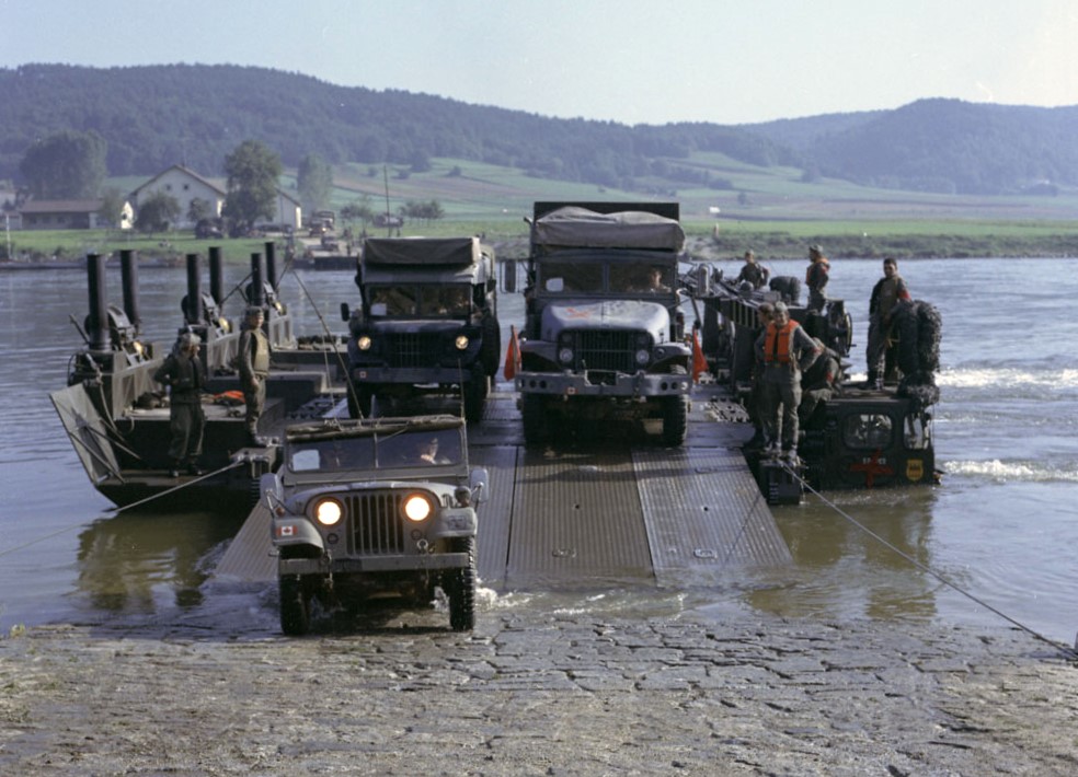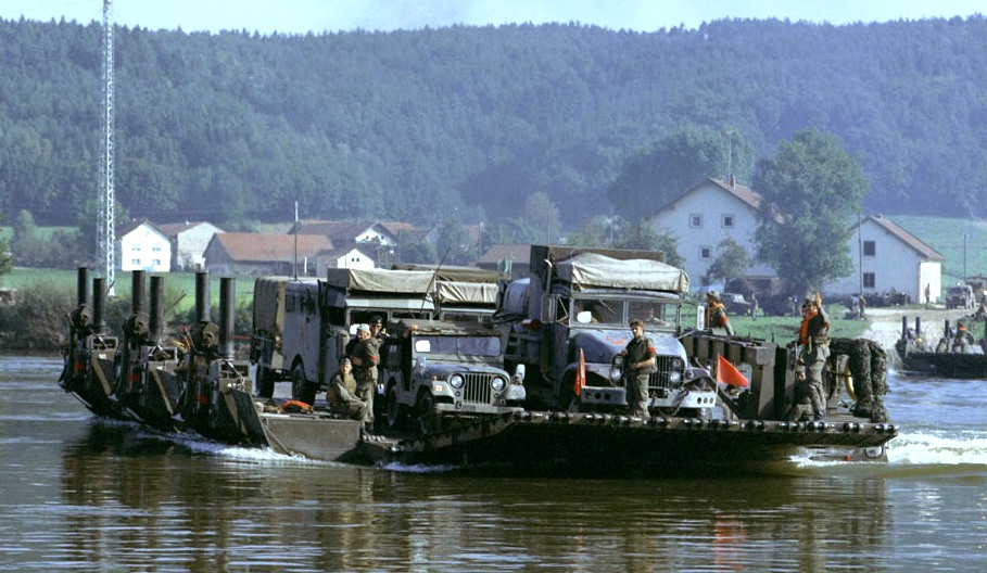 4 CMBG, 4 Service Battalion trucks being ferried across the Danube River during Exercise Gross Rochade, Bavaria, Germany, Sep 1975.