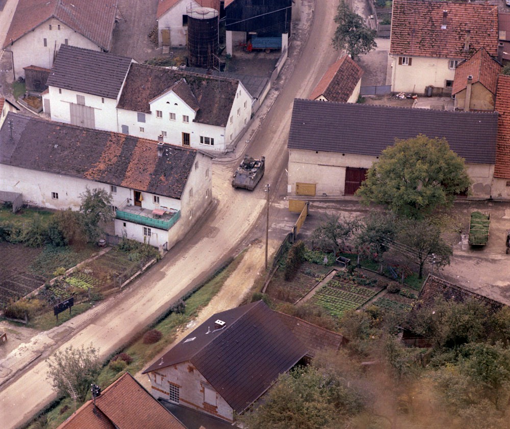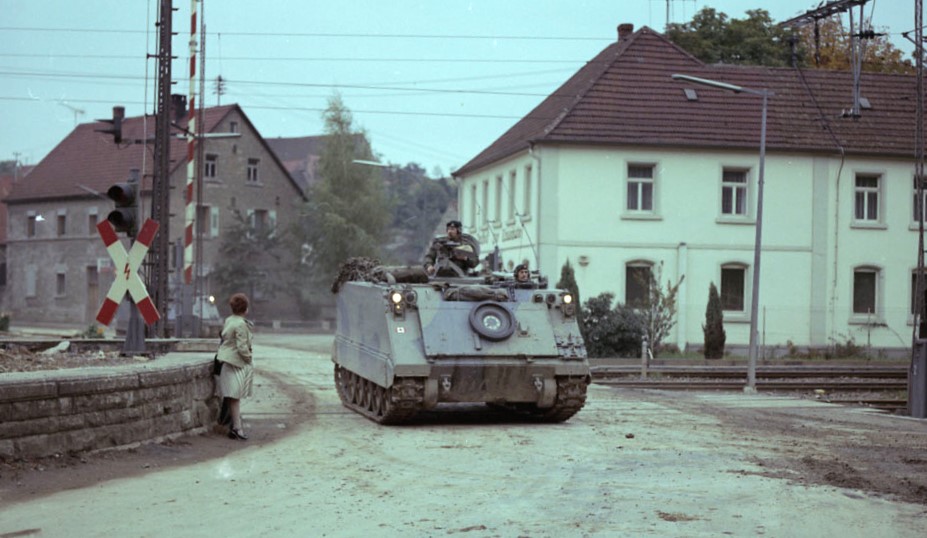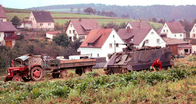 M113, R22eR, Eilheim, Ex Reforger 74, view from a medieval castle tower, Germany, Oct 1974.