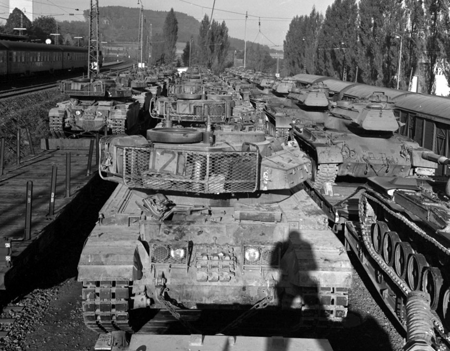 Fallex 71, Centurion tanks, RCD, and American M47 Patton tanks, Ex Reforger III, on a railway siding in Germany, 9 Oct 1971.
