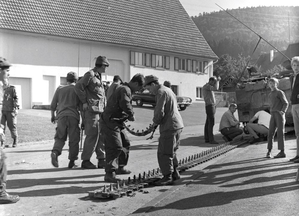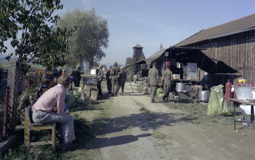 Ex Reforger 74. It wasn’t all bad news for a Centurion tank crew that had broken down in the village of Zimmern, Germany. They were taken in by a German family and for the three days they were there during the exercise, there was lots of fresh food available, and whatever comfort the barn afforded from the constant drizzle and cold. Sgt. Grand, kneeling, passes the plate to Mrs. Pfister while Mrs. Pfister holds the “refreshments”. At the rear standing is Sgt Linden Grant, and MCpl Rowland, and feeding the elder daughter of the Pfisters (who served as the translator) is Cpl Breault, October 1975..