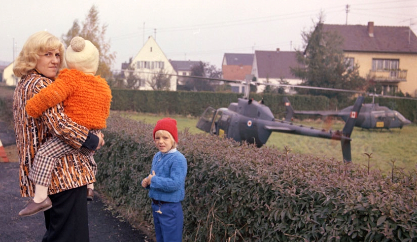Ex Reforger 74 in Germany. A German mother and family are more distracted by the photographer than by the No. 444 Squadron helicopters in the front yard – with the exception of the small child mother is holding, October 1974.