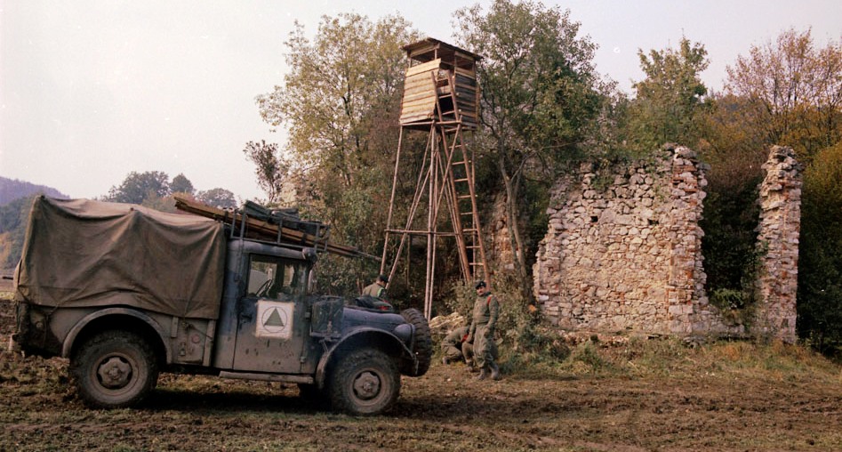 A Canadian 3/4 ton truck stands waiting during a pause in Ex Reforger 74 near Wilheim in West Germany. In the background is a German shooting outpost where hunters sit and wait for the game to pass by, and at right are the remains of an ancient house, 1974.