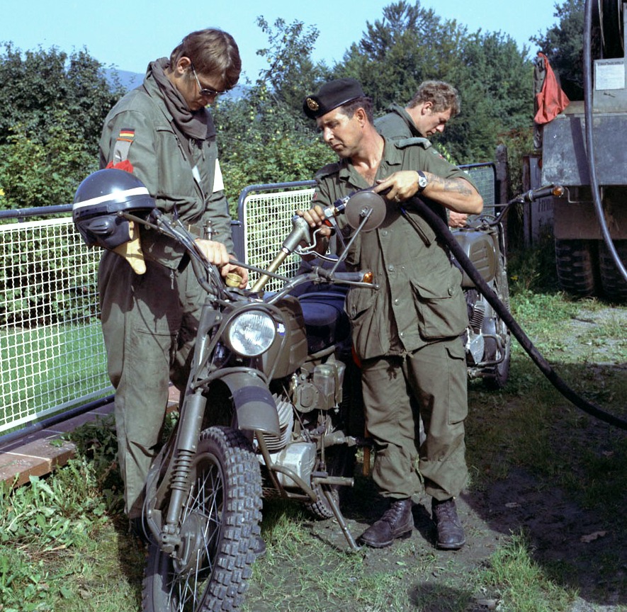 4 CMBG, Ex Grosse Rochade, Cpl Beauchamps fuels German Army motorcycle, 18 Sep 1975.