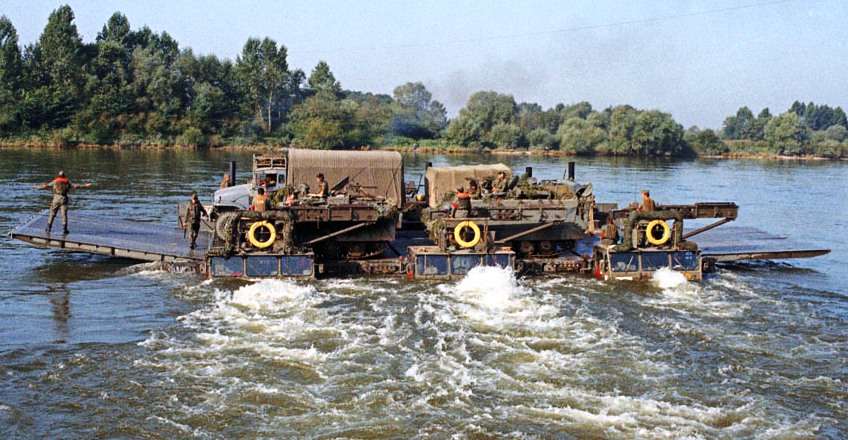 M113 APC’s crossing the Danube river in Germany using a double story Medium Girder Bridge laid by 4 Engineer Field Squadron, 25 Sep 1971.