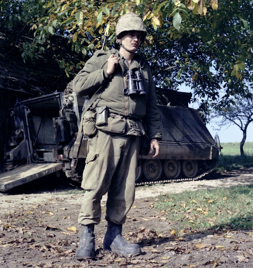 M113 of 1 R22eR,guarded by 3 Mech Cdo soldiers, Ex Reforger 74, Germany, Oct 1974.