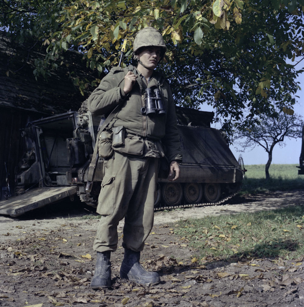 M113 with .50 cal MG, Ex Reforger 74, Germany, 1 R22eR, Oct 1974. Cpl Côté, one of the 194 militiamen attached to 4 CMBG for the exercise, listens to instructions from Pte Barry of 1 R22eR. October 1974.