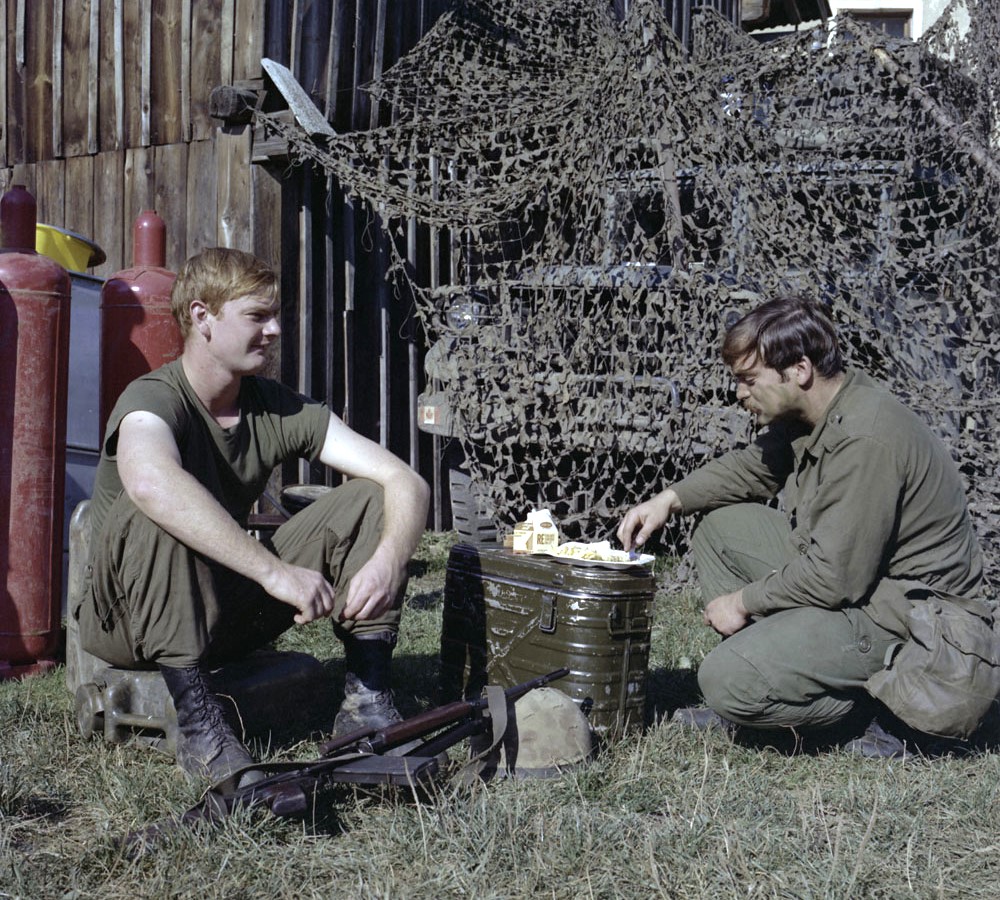 Fallex 76, Bavaria West Germany. Two Canadians soldiers have a quick lunch during the exercise, September 1976.