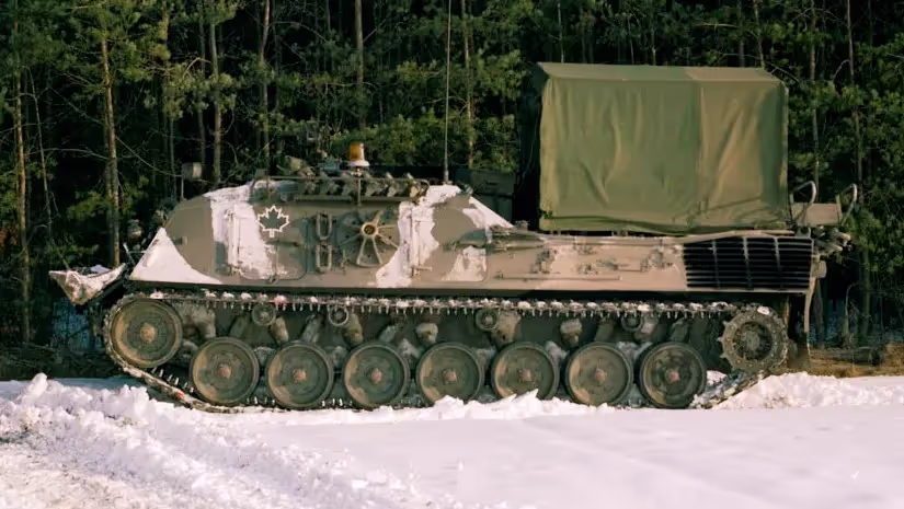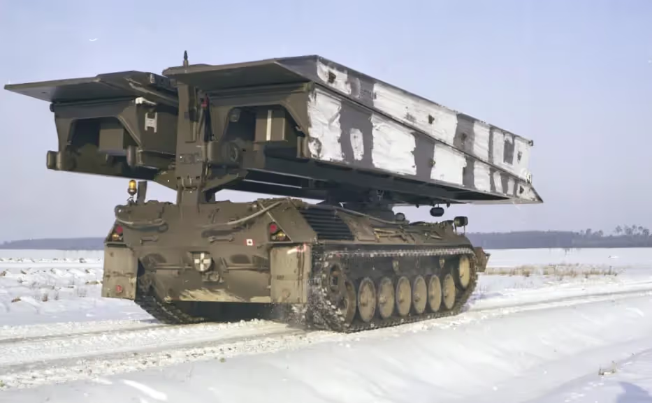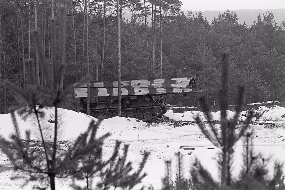 4 CMBG Beaver armoured vehicle-launched bridge (AVLB), Ex Certain Sentinel, Western Bavaria, Germany Feb 1979.