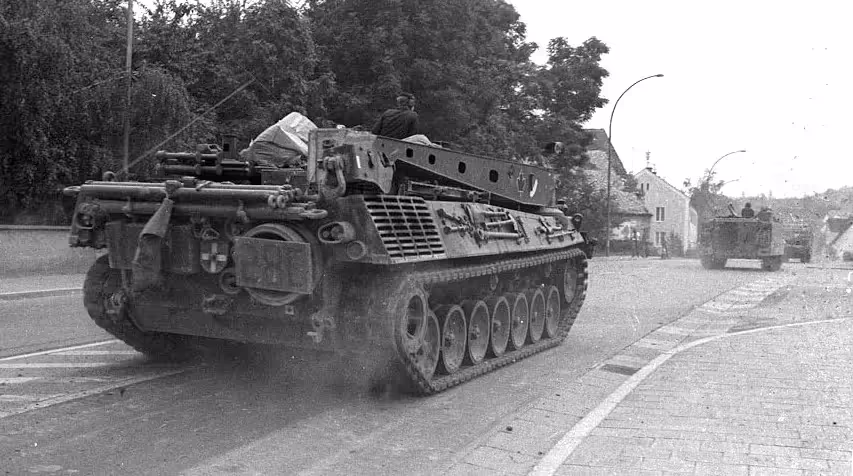 Fallex 77. Beaver armoured vehicle-launched bridge (AVLB), moving through a small German town, Sep 1977.