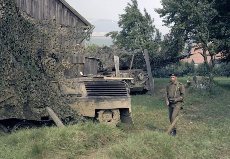 Fallex 77, Two 4 CMBG Leopard tanks hiding beside a German farm during Ex Carbon Edge , September 1977.