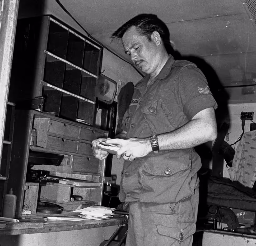 Fallex 77. Cpl. Desmarais sorting mail in back of 2-1/2 ton van during Fall training at Hohenfels, Germany, September 1977.